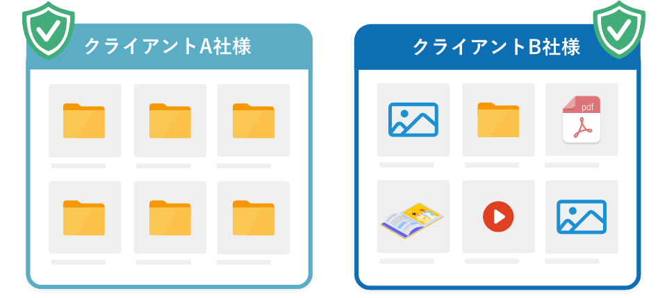 顧客やプロジェクト単位で独立した専用テナント(環境)を作成可能。フォルダの権限設定ミスによる「他社データの混入」や「機密情報の流出」を物理的に防ぎます。